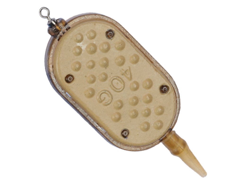 e stlačenou krmítkovou směsí nebo peletami odhodíte daleko i za silného větru. Tvar krmítka zaručuje, že drží při dně i v proudu. Součástí krmítka je obratlík velikosti č. 8, který můžete popřípadě vyměnit za rychlovýměnný, pro rychlou výměnu návazce. Při vyjmutí obratlíku můžete krmítko používat jako průběžné.